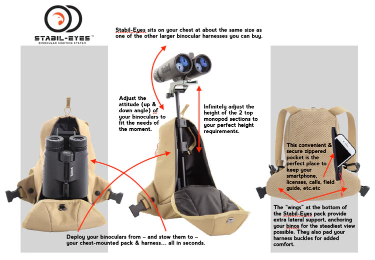 Beyond Hands-Free, Fatigue free glassing, in developing Stabil-Eyes we determined it had to be entirely self-contained and as easy to carry and use as a regular binocular harness. Carrying extra parts or having to assemble pieces in the field was simply NOT acceptable.